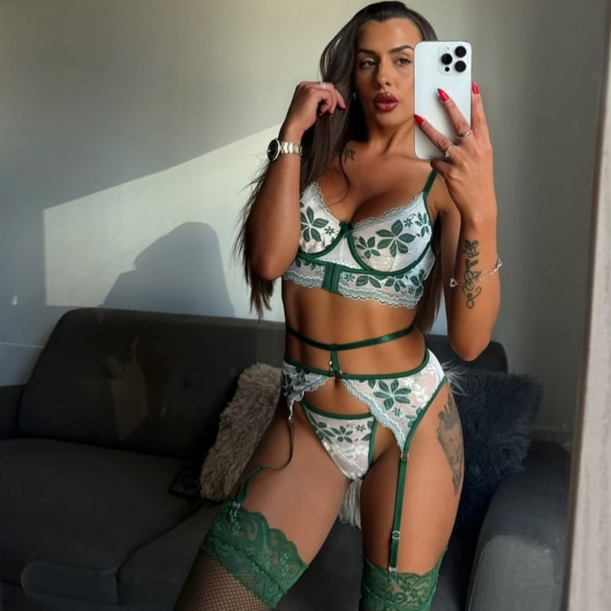 Step into a world of elegant seduction with Lustful Leaves. This 4-piece lingerie set features striking green leaf lace, contrast accents, and delicate stockings that enhance your curves while exuding a vintage, high-end vibe. Perfect for intimate evenings, boudoir photography, or making a bold statement with layered sophistication.