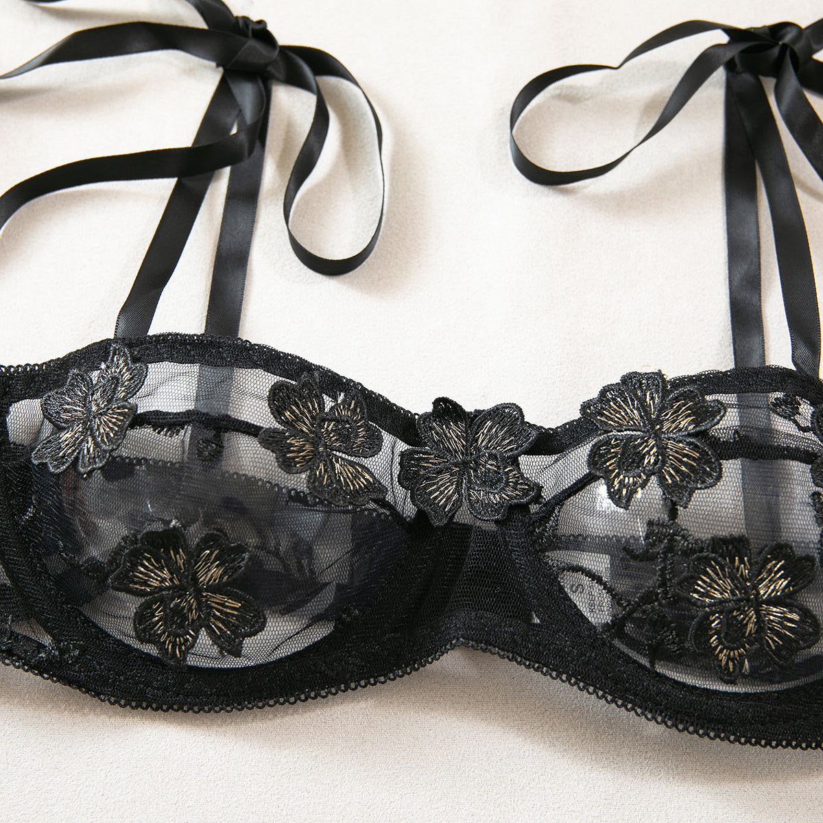 Embrace elegance with Noir Blossom. This black two-piece lingerie set features delicate floral embroidery, a playful bow tie, and adjustable tie details for a seductive and feminine look. Perfect for intimate nights or romantic moments.